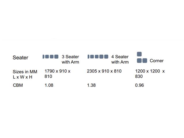 3 Seater with Arm (1790 X910X 810 ), 4 Seater with Arm (2305 X 910 X 810) ,Corner (1200 X 1200 X 830)