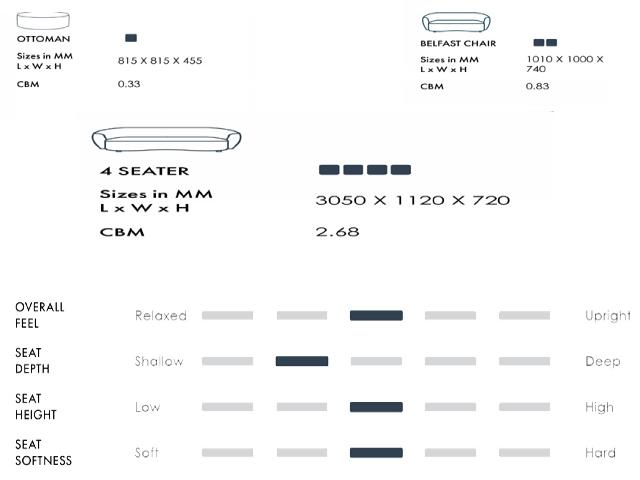 Sizes in MM L x W x H 815 X 815 X 455 CBM 0.33 BELFAST CHAIR Sizes in MM L x W x H 1010 X 1000 X 740 CBM 0.83 4 SEATER Sizes in MM L x W x H 3050 X 1120 X 720 CBM 2.68